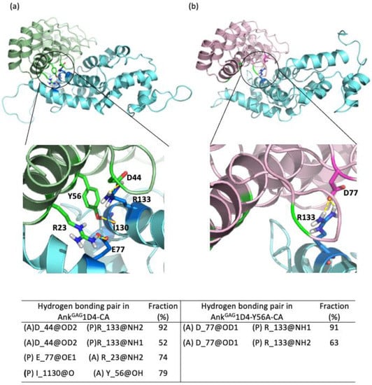 Important hydrogen bonding pairs of both the (a) AnkGAG1D4-CA and (b) AnkGAG1D4-Y56A-CA complexes. R23, D44, and Y56 (green sticks) of AnkGAG1D4 making hydrogen bonds with CA (blue sticks) while the hydrogen bond between D77 and R133 in AnkGAG1D4-Y56A-CA is shown in pink and blue sticks. R23, D44, and Y56 that are making hydrogen bonds with the CA in AnkGAG1D4-CA are at a distance that is too far to establish hydrogen bonds at the AnkGAG1D4-Y56A-CA complex (green shading in b). The table lists the hydrogen lifetime where (A) denotes residues from AnkGAG1D4-CA/AnkGAG1D4-Y56A while (P) denotes residues from CA.