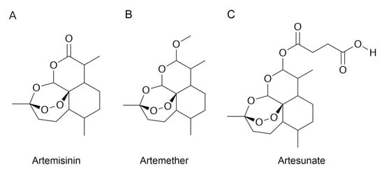 Chemical structures of (A) artemisinin, (B) Artemether, and (C) Artesunate.