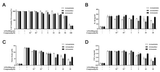 Effects of artemisinin, artesunate, and artemether on (A) cell viability, (B) interleukin-1 (IL-1), (C) nitric oxide, and (D) tumor necrosis factor- (TNF-) production in lipopolysaccharide (LPS) treated BV2 microglial cells.