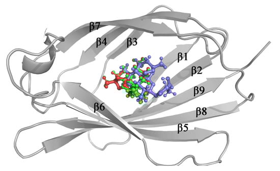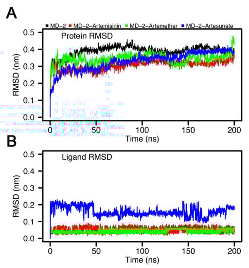 In order to investigate the interactions between each ligand and MD-2, molecular docking was performed to predict the binding mode between each ligand and MD-2 at the atomic level. As shown in Figure 3, MD-2 has a total of 9 -strands and all three ligands are bound in the cavity. Artemisinin, Artesunate and Artemether have similar binding poses, with lowest binding energies of −28.28 kJ · mol , −27.53 kJ · mol , −26.74 kJ · mol , respectively. Hydrophobic interactions have been observed between ligands and MD-2. The interacting residues are shown in Figure S1. Most of the residues were hydrophobic (residue Ile46, Leu61, Phe76, Leu78, Val135, and Phe151). It is reported that the residue Cys133 would stabilize the chemicals in the MD-2 binding cavity through covalent bond [33], while covalent interactions between the residue Cys133 and ligands in the MD-2 pocket were not observed. The binding pose for each MD-2 inhibitor in the MD-2 with the lowest energy was selected for molecular dynamics simulation.