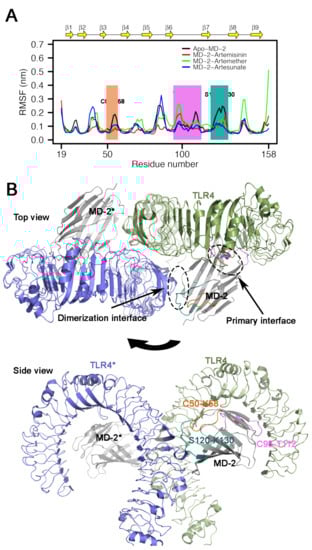 The root mean square fluctuation (RMSF) of backbone atoms of Apo-MD-2 and ligand binding MD-2 complexes were analyzed to measure the mobility of the MD-2 residues. As shown in Figure 5A, the large fluctuations of residues mainly occur in loops and in both termini regions, whereas relatively lower RMSF values are associated with -strands for all simulations. The overall RMSF patterns are similar in the presence of ligand binding. In particular, ligand binding decreased the flexibility of loop between the 3 and 4 (residue C50–K58) region and between the 7 and 8 (residue S120–K130) region. Moreover, the fluctuation of RMSF between different ligands was also distinct, which may be related to the different binding sites of the ligands. The binding orientation of artemether, artesunate and artemisinin in the MD-2 pocket were altered significantly during the simulation (see Figure 6). As depicted in Figure 5B, the crystal structure reveals that the loop region 7–8 is located at the dimerization interface of TLR4. This loop has been reported to play crucial roles in TLR4/MD-2 activation [34]. Specifically, amino acids Ile124 and Phe126 in this loop have been demonstrated experimentally through downstream signaling activation as mutation led to a reduced capacity to form dimer of TLR4/MD-2 complex [35,36]. In the presence of ligand, comparably low flexibility of Ile124 and Phe126 were observed. This observation may suggest that the binding of artemisinin and its derivatives to MD-2 reduces the conformational changes of the 7–8 loop thereby inhibiting TLR4-MD-2 dimerization and preventing immune response. Although the loop region 3–4 does not interact directly with TLR4, decreased fluctuations were observed upon ligand binding, suggesting that this region also had an influence on the dimerizaiton activity of TLR4-MD-2, which is consistent with previous TLR4-MD-2 simulations [37,38]. In contrast, the loop region bridging 6 and 7 (residue C95–T112) showed a increased fluctuations upon ligand binding, which is located at the primary contact interface between TLR4 and MD-2. As reported previously, the primary contact interface between TLR4 and MD-2 is formed before ligand binding [21,39,40]. This observation suggests that the binding of artemisinin and its derivatives to MD-2 reduces the TLR4-MD-2 stability.