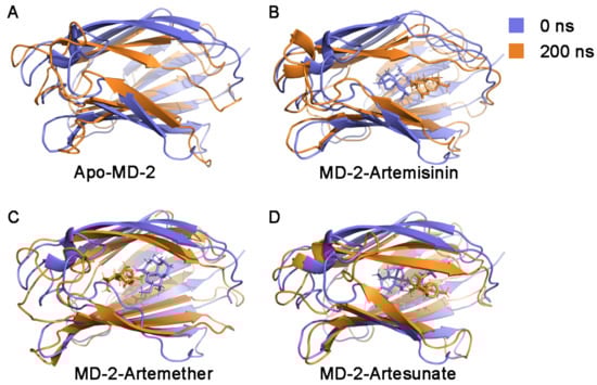 Structural superimposition of initial (0 ns) and final configurations (200 ns) of (A) Apo-MD-2, (B) MD-2-Arteminsinin complex, (C) MD-2-Artemether complex, and (D) MD-2-Artesunate complex. Initial conformations are colored in blue. Final conformations are colored in orange.