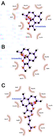Interactions of MD-2 with (A) artemisinin, (B) artemether and (C) artesunate. The last frame of the MD simulation was used for these plot.