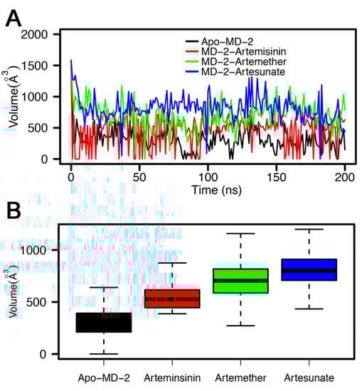 Ligand binding pocket volume (A) in line plot as a function of simulation time and (B) in barplot for Apo-MD-2, MD-2-Artemisinin, MD-2-Artemether and MD-2-Artesunate systems over the 200 ns simulation.