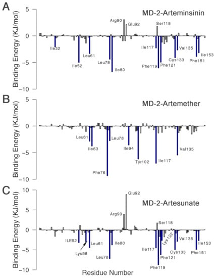 Per-residue decomposition of binding free energy contributions of (A) MD-2-Arteminsinin complex, (B) MD-2-Artemether complex, and (C) MD-2-Artesunate complex. Free energyies less than −2 KJ· mol are highlighted in blue.