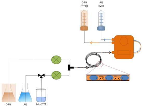 In a preliminary phase, a prototype of the automatic system was assembled and tested with the aim of optimizing the flow rates of the biphasic system (NaOH 6 M/MEK) to achieve a proper separation. Subsequently, “cold” tests (without radioactivity) were performed to optimize the process conditions (volumes, transfer speed, slug-flow regime, loop dimensions, residence times of the sample in the loop, speed, and separation times). Capillary dimensions (ETFE capillary loop 1/8 inch, length = 106 cm; internal diameter 1.59 mm; internal volume about 2.1 mL) and flow rate (0.5 mL/min) are calibrated to maximize the contact between the two phases by achieving a slug-flow regime), the most suitable regime for liquid–liquid extraction on a micro-scale [40]. A schematic diagram of the overall system as it was assembled and installed is reported in Figure 2.