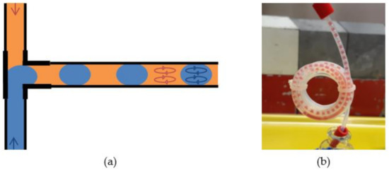 (a) Operating principle with schematic representation of internal circulation within the two phases and (b) photo of a slug-flow regime in the loop in which the organic phase has been colored red by adding a dye.