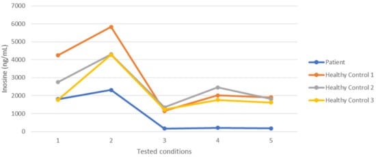 PNP is involved in the purine metabolism converting inosine to hypoxanthine. The reaction catalyzed by PNP did not occur on DPS; thus; hypoxanthine was not considered for the determination of ADA2 activity. As the basal inosine concentrations resulted to be different in different samples, we decided to consider two time points of the reaction.