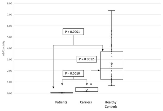 Table 1. ADA2 activity, expressed as mean ± SD, was 2.63 ± 1.7 mU/mL in healthy controls, 0.02 ± 0.03 mU/mL in DADA2 patients, and 0.025 ± 0.18 mU/mL in carriers.