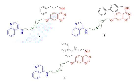 The main characteristics concerning these three compounds are that (i) all of them possess a quinoline scaffold at one end and an amino-quinazoline scaffold at the other end and (ii) a very important and specific linker with a cyclic piperidine methanol moiety connects these two scaffolds together.