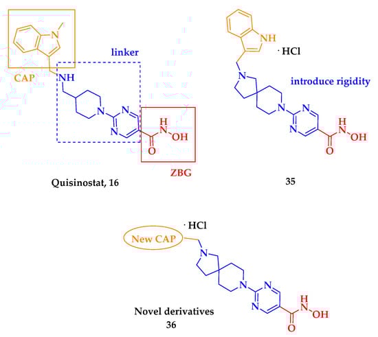 Ruoxi Li et al. reported this year [45] their results of a new series of PfHDAC1 inhibitors with dual-stage antimalarial potency and improved safety which was based on structural modifications of quisinostat. Quisinostat (16) showed potent antimalarial in vitro activity [46] and inhibited both wild-type and drug-resistant P. falciparum strains with IC50 values 5–7 nM. Based on these findings, the authors elaborated a focused library of 31 novel hydroxamic acid derivatives and evaluated their efficacy as antimalarials. Similar to other HDAC inhibitors, the authors conceived their structures considering the three important components of quisinostat: an hydroxamic acid that chelates the Zn2+ cofactor in the catalytic pocket (ZBG), an N-methylindole fragment (CAP region) entering in favorable interactions with the amino acid residues at the entrance of the catalytic pocket and the linker between these two entities that is a pyrimidinyl 4-aminomethyl piperidine fragment (Figure 7). The authors focused on the modification of the linker, while the critical scaffolds of hydroxamic acid and indole were mainly preserved. Concerning the linker, the authors oriented their efforts towards the introduction of a rigid spirocyclic moiety [47], in contrast to the most widely applied flexible aliphatic diamine linkers existing in HDAC inhibitors’ strategy.
