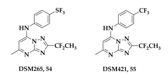 The dihydroorotate dehydrogenase (DHODH) enzyme catalyzes the fourth step in the de novo pyrimidine biosynthesis [66,67], i.e., the flavin mononucleotide-dependent oxidation of L-dihydroorotate to orotate. For Plasmodium parasites, the de novo pyrimidine synthesis is an essential pathway for their survival [68] as Plasmodium lacks any salvage pathways to generate pyrimidines. In this respect, two compounds are already reported as DHODH inhibitors. Compound DSM265 (54) is currently in phase II of clinical trials with activities against both asexual blood-stage and liver-stage parasites. Along with compound DSM421 (55), they are the most well studied and clinically relevant antimalarial DHODH inhibitors [69]. It is worth mentioning that they both bear a fluorinated triazolopyrimidine scaffold (Figure 8).