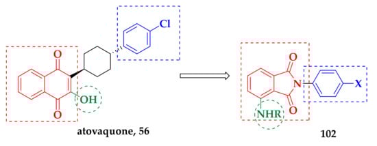 Concerning the cytochrome complex, atovaquone (56) (Figure 9) is reported [70] to be the leading compound/drug against the bc1 target. Atovaquone is approved in the market of the United States under the trade name Mepron for the treatment of Pneumocystis carini infection. It is also available in combination with proguanil hydrochloride under the trade name Malarone for the treatment and prevention of P. falciparum uncomplicated malaria [71,72,73]. Atovaquone is a ubiquinone analog acting as a competitive inhibitor at the Q0 site of cytochrome bc1 [74]. Unfortunately, the development of point mutations in the Q0 site of cytochrome bc1 from the parasite results in the formation of atovaquone-resistant strains, which can considerably reduce the anti-malarial efficacy of atovaquone. Nevertheless, based on atovaquone, and the primary important scaffold (commercially available) lawsone (57), many efforts have been deployed in order to find new lead compounds which could circumvent the drug resistance of the parasite.