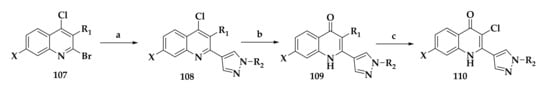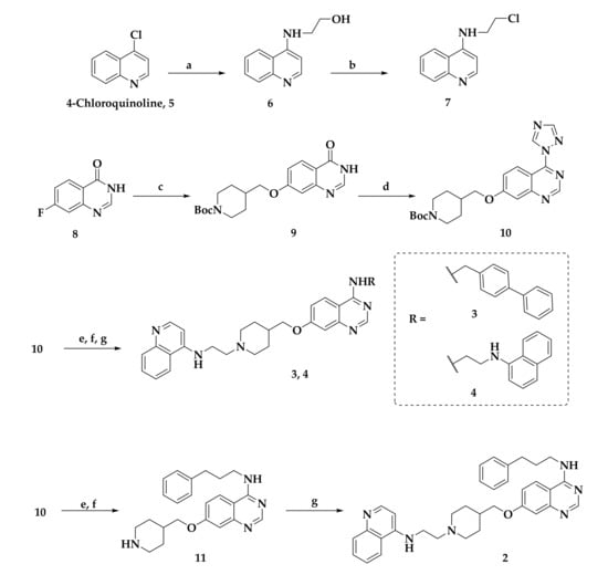 The key elements in the synthetic route adopted by the authors are developed and shown below (Scheme 1) [19,20]. Quinoline 7 was first obtained in a two-step procedure and 91% yield from 4-chloroquinoline 5 after a reaction with ethanolamine, followed by thionyl chloride treatment. Starting from 7-fluoro-quinazoline derivative 8, the authors first decided to introduce the N-Boc methanol-piperidine moiety. Afterward, chlorination of the pyrazolinone group, following a two-step procedure used in pyrimidine chemistry [21], resulted in the formation of the 4-triazolyl-quinazoline intermediate 10 in 66% total yield. Compound 10 was allowed to react with phenylpropyl amine, which upon N-Boc-deprotection with TFA, afforded compound 11. Coupling of the piperidine frame with the quinoline derivative 7 led to the target compound 2 in an overall yield of 61% from 10. Compound 10 was also used for the synthesis of target compounds 3 and 4. The sequence of reactions is the same as before affording compound 3 in 29% yield and 4 in 45% starting from compound 10.