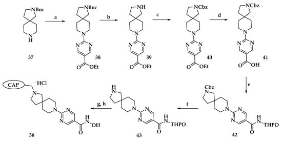 Scheme 4 presents the synthesis of spirocyclic derivatives 36 via a different method from that already reported for quisinostat [48]. Tert-butyl-2,8-diaza spiro-(4,5)-decane-2-carboxylate (37) was coupled with ethyl 2-chloropyrimidine carboxylate under alkaline conditions to afford ester 38 in 86% yield. A two-step modification of the protective group (Cbz vs. Boc) by acid elimination of Boc and installation of the benzyloxy carbonyl group led to compound 40 in 94% yield. Further hydrolysis of the ethyl ester providing the appropriate carboxylic acid was followed by conversion into 42 via condensation with O-(tetrahydro-2H-pyranyl-2-yl) hydroxylamine in excellent yields. Hydrogenolysis of the Cbz group afforded the intermediate 43 possessing a free secondary amine. This function was then coupled under reductive amination conditions with a variety of aldehydes leading to the final compounds 36 with yields varying between 20% and 30% for this final step.