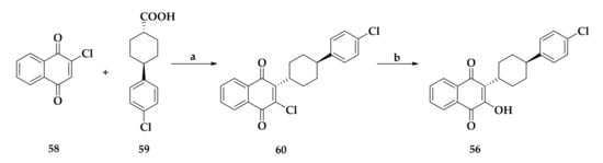 The first synthesis of atovaquone was reported by Hudson et al. [75,76]. 2-chloronaphthoquinone (58) reacts through a radical pathway with trans-4-chlorophenylcyclo-hexane carboxylic acid (59) in the presence of AgNO3 and ammonium persulfate (Scheme 6). Hydrolysis of the obtained chloro-atovaquone derivative 60 with methanolic KOH leads to atovaquone (56) in 4% overall yield. By following the same synthetic strategy, three more procedures have been reported [77,78,79] without better success in terms of yield and cost-efficacy.