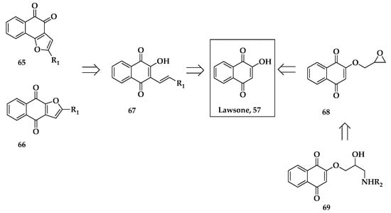 Knoevenagel aldol condensation of lawsone (57) with various aldehydes afforded the first family of dienol compounds 67 with yields varying between 32% and 91%. The second and third family of compounds are furano-naphthoquinones 65 and 66 that can be selectively obtained either by application of kinetic control (ortho-compounds 65) or thermodynamic (para-compounds 66) in yields varying between 20% and 92% (Scheme 9). The authors also synthesized a fourth series of compounds issued from a two-step reaction: etherification of the hydroxy group of lawsone (57) by reaction with epichlorohydrin and the subsequent opening of the resulting epoxide ring with selected amines. The overall yields are quite low and oscillate between 20% and 30%.