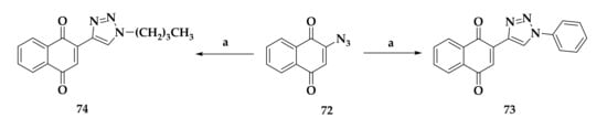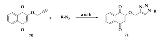 - Oramas-Royo, S.; López-Rojas, P.; Amesty, A.; Gutiérrez, D.; Flores, N.; Martín-Rodríguez, P.; Fernández-Pérez, L.; Estévez-Braun, A. Synthesis and Antiplasmodial Activity of 1,2,3-Triazole-Naphthoquinone Conjugates. Molecules 2019, 24, 3917. [Google Scholar] [CrossRef]