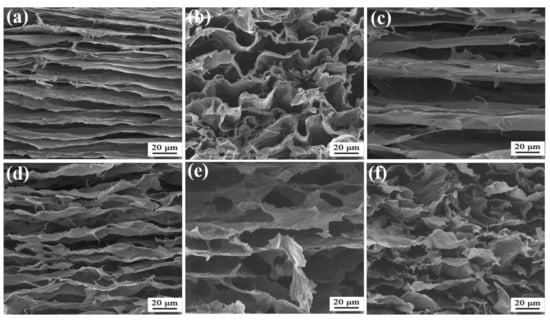 Biomass, as the most abundant and sustainable resource on the earth, has been regarded as an ideal carbon source to prepare various carbon materials. A series of carbon aerogels based on biomass resources such as chitosan [14], kapok [15], waste paper [16], poplar catkin [17], bacterial cellulose [18], and wax gourds [18] have been prepared through freeze-drying and subsequent carbonization. Nonetheless, manufacturing shape-memory carbon aerogels with excellent compressibility and elasticity from biomass remains an open challenge. The disordered three-dimensional texture causes structural damage at a high compression strain, resulting in poor shape-memory performance. The reasonable design of a microstructure that facilitates the effective transfer of stress and recovers its shape under high compression strain is highly required. Anisotropic, yet ordered, structure is ubiquitous in nature and exhibits high mechanical strength, fatigue resistance, and efficient ion conducting or mass transport at specific direction, such as wood and bamboo [19,20,21,22,23].