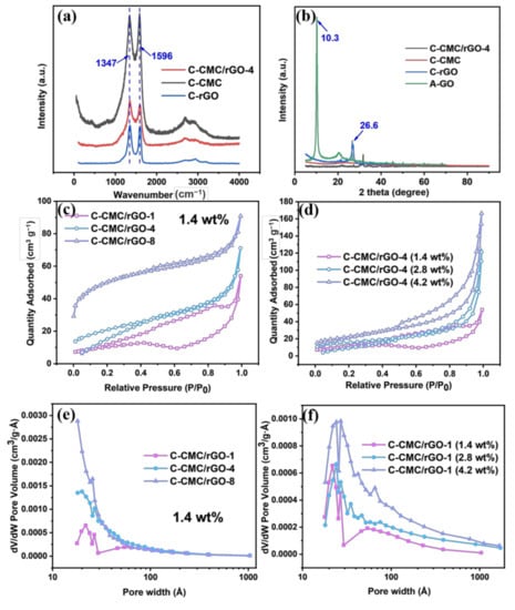 Figure 3. (a) Raman patterns of C-CMC, C-CMC/rGO-4 and C-rGO. (b) XRD patterns of C-CMC/rGO-4, C-CMC, C-rGO, and A-GO. The N2 adsorption-desorption isotherms of (c) C-CMC/rGO-1, C-CMC/rGO-4 and C-CMC/rGO-8 (1.4 wt%), and (d) C-CMC/rGO-1 (1.4 wt%), C-CMC/rGO-1 (2.8 wt%) and C-CMC/rGO-1 (4.2 wt%). The pore size distribution of (e) C-CMC/rGO-1, C-CMC/rGO-4 and C-CMC/rGO-8 (1.4 wt%), and (f) C-CMC/rGO-1 (1.4 wt%), C-CMC/rGO-1 (2.8 wt%) and C-CMC/rGO-1 (4.2 wt%).