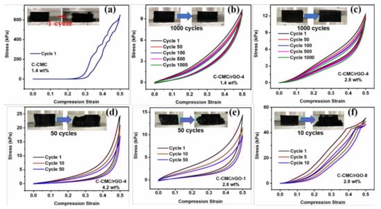 Figure 4 demonstrates the mechanical properties of C-CMC/rGO-x. Carbon aerogel C-CMC is fragile and tends to collapse for only one cycle at 50% strain (Figure 4a). However, CMC/GO carbon aerogel (C-CMC/rGO-4) can withstand 1000 cycles at 50% compression strain and maintain its macrostructure and no obvious plastic deformation is observed (Figure 4b). The stress retention and height retention of C-CMC/rGO-4 (1.4% solid content) are high up to 93.6% and 95.5%, respectively, which is a sharp contrast to C-CMC. The result demonstrates that GO also remarkably improves the mechanical strength of carbon aerogel, which is likely due to the well-maintained structure and the intrinsic high strength of GO. Furthermore, the stress strain hysteresis ring in the curve is small, indicating no significant plastic deformation during cyclic compression owing to the reversible compression.
