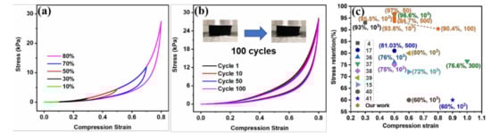 Figure 5. (a) Stress-strain curves of C-CMC/rGO-4 (1.4% solid content) at different compression strains. (b) stress-strain curves for 100 cycles at 80% strain. (c) the comparison of stress retention at different compression cycles of C-CMC/rGO-4 with those of other carbon aerogels (stress retentions at different compression cycles are shown in the parenthesis).