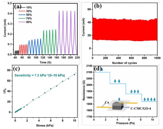 Sensitivity (S) is defined as S = δI/I0)/δP, where ΔI is the relative change of current, I0 is the initial current without pressure applied, and δP is the change of applied pressure. Figure 6c demonstrates the linear sensitivity of C-CMC/rGO-4 from 0 to 10 kPa (equivalent to 0–50% compression strain) is 7.3 kPa−1, illustrating a high linear sensitivity to detect a wide range of pressure. The pressure detection limit was measured by dropping water on the assembled sensor, and each water drop equates to 2.75 Pa applied on the sensor (Figure 6d). It is found that the detection limit is as low as 2.75 Pa, and the current increases with increasing number of water drops.