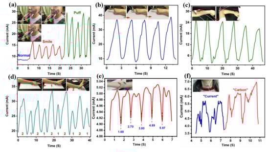 Figure 7. Application of C-CMC/rGO-4 in detecting biosignals from human. Current signals from (a) face expressions, (b) finger, (c) elbow, (d) wrist bending, (e) pulse and (f) vocal cords.