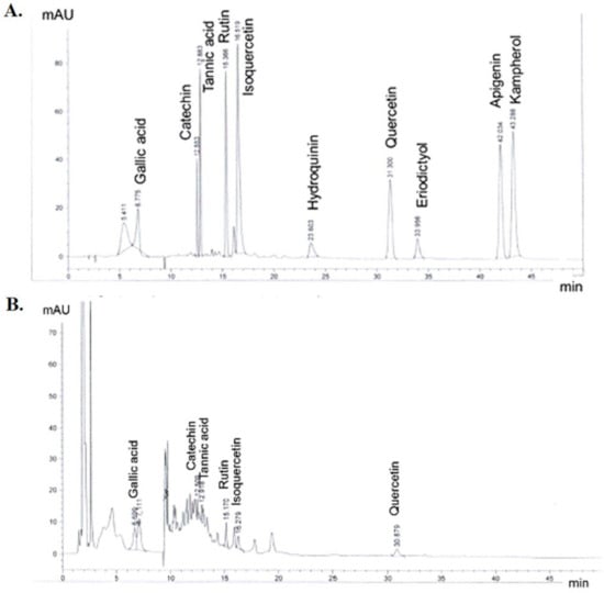 A representative LC-MS chromatogram of (A) the standards of the phenolic compounds, and (B) gallic acid, catechin, tannic acid, rutin, isoquercetin, and quercetin contained in Caulerpa lentillifera extract (CLE).