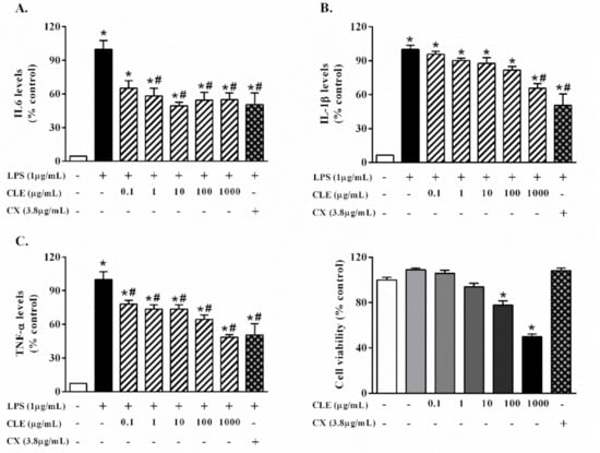 The effects of CLE on inflammatory cytokine production in LPS-stimulated RAW 264.7 cells. RAW 264.7 cells were treated with LPS in the absence or presence of different concentrations of CLE for 24 h. The production of (A) IL-6, (B) IL-1β, and (C) TNF-α was measured by ELISA. (D) Viability of RAW 264.7 cells after exposure to different concentrations of CLE with or without LPS for 24 h. Values shown are mean ± S.E.M. (n = 5); * p < 0.05 vs. control and # p < 0.05 vs. LPS.