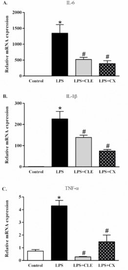 The effects of CLE on the expression of inflammatory cytokine genes in LPS-stimulated RAW 264.7 cells. RAW 264.7 cells were treated with CLE at 10 µg/mL in the presence or absence of LPS for 24 h. The expression of (A) IL-6, (B) IL-1β, and (C) TNF-α was measured by qPCR. Values shown are mean ± S.E.M. (n = 5); * p < 0.05 vs. control and # p < 0.05 vs. LPS.