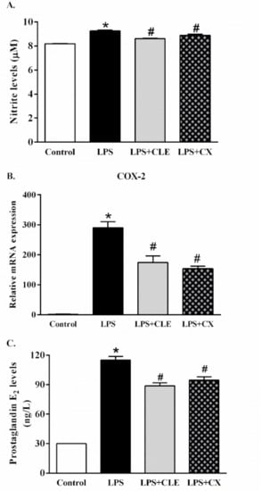 The effects of CLE on NO production, COX2 gene expression, and PGE2 production in LPS-stimulated RAW 264.7 cells. RAW 264.7 cells were supplemented with CLE or CX in the presence or absence of LPS for 24 h. The production of NO (A), the expression of cyclooxygenase-2 (COX-2) (B), and prostaglandin E2 (PGE2) levels (C) were evaluated. Values shown are mean ± SEM (n = 5); * p < 0.05 vs. control and # p < 0.05 vs. LPS.