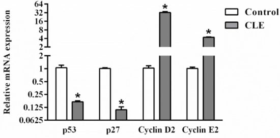 The effect of CLE on immune response enhancement was further investigated using qPCR. As shown in Figure 6, the expression of p53, a tumor suppressor gene, was inhibited by CLE compared with the control. Similarly, p27, a cell cycle inhibitor, was also suppressed by CLE. However, the expression of cyclin D2 and cyclin E2, which are cell cycle inducer genes, was increased in CLE-treated cells. These data suggest that CLE stimulated the immune response by modulating cell cycle regulators.