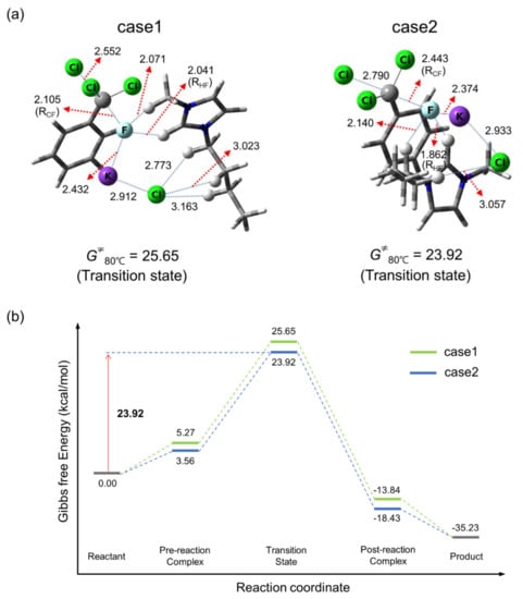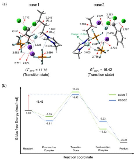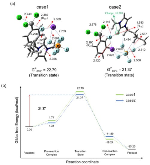 First, we study the case of using a substrate:KF ratio of 1:1, in which the metal salt acts only as fluorinating agent, that is, as the source of F−, thus no salt effects may be ascribed to this situation. Figure 2 presents the transition sates (TSs) and energetics for this process (for coordinates and structures of pre- and post-reaction complexes, see Supplementary Materials. The reference for the zero of the free energy is taken as the ‘free’ reactants, for which the substrate, the CIPs KF, [bmim]PF6 or [bmim]Cl are all separated from one another in solution phase). The IL [bmim]PF6 and KF are used as the promoter and fluorinating agent, respectively, in the same amount as the substrate (substrate:KF:[bmim]PF6 = 1:1:1). We found two reaction routes, case 1 and case 2 with Gibbs free energy of activation G‡ of 22.8 and 21.4 kcal/mol, respectively. The energetics of the reaction depicted in Figure 2 predicts that the reaction would proceed by the mechanism with lower G‡ (case 2) according to the Curtin–Henderson principle (When no equilibrium occurs between the free reactants and pre-reaction complex, the reaction proceeds preferably via the path with the lowest Gibbs free energy TS, irrespective of the Gibbs free energies of pre-reaction complexes) [29]. Here, the metal salt KF reacts as a contact ion pair, and electronegative F atoms in the IL anion PF6− act as Lewis base coordinating to the counter-cation K+, alleviating the latter’s adverse Coulombic influence on the nucleophile F−. The main difference between the two mechanisms is the position of the counter-cation K+. It seems that in (Case 2), K+ is further stabilized by interacting with the electron abundant phenyl ring.