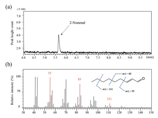 Chromatogram (a) and mass spectrum (b) obtained from standard 2-nonenal. The dotted lines in the structure represent the fragments of 2-nonenal.