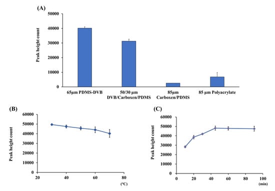 Effects of (A) fiber coatings, (B) temperature, and (C) time on the HS–SPME of 2-nonenal. For HS–SPME, 100 ng of 2-nonenal in gauze was extracted by (A) fiber exposition at 50 °C for 45 min, (B) for 45 min with PDMS-DVB, and (C) at 50 °C with PDMS-DVB.