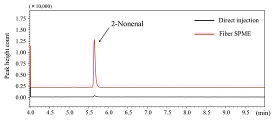 Typical total ion chromatogram of 2-nonenal obtained by (a) direct injection (200 ng/mL solution, 1 µL) and HS–SPME (200 ng/mL solution, 100 µL in 40-mL vial).