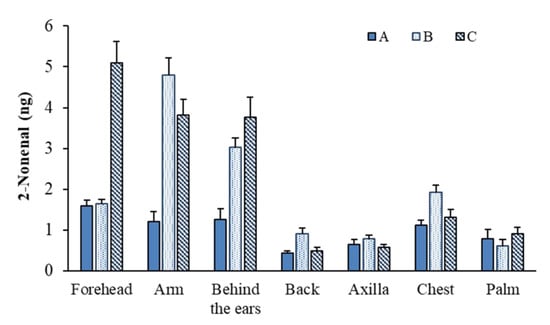 Comparison of 2-nonenal contents in body odor samples collected from several body parts (A: female in their 20 s, B: male in their 20 s, C: male in their 30 s).