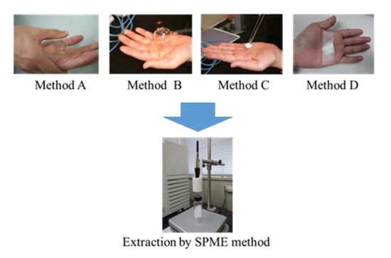 Four sampling methods for the collection of skin emissions and secretions were compared. Figure 7 shows the sampling methods from the palm of the hand. Sampling was carried out 3 h after washing the skin surface with soap. In method A (solution method), 2 mL of distilled water were added to a glass cup, and the cup was inverted so that the water touched the skin on the palm of one hand for 5 min. The aqueous solution was subjected to the above HS–SPME method. In method B (headspace method), a suction cup is placed on the palm, the SPME fiber needle is inserted through the septum into the cup under reduced pressure, and then, the fiber is exposed for 5 min to extract the skin emissions. In method C (wiping method), a 2 cm square area of the palm was wiped for 1 min with 0.1 g of dry gauze as a collecting material of skin emissions and secretions, which was then placed in a vial and subjected to the above HS–SPME method. In method D (pasting method), 0.1 g of dry gauze was taped to the palm and extracted for 3 h. These collecting materials were then subjected to the HS–SPME as in method C.