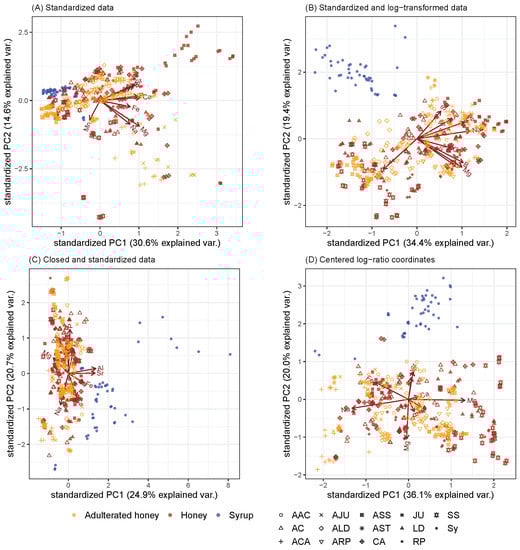 Figure 1 shows the first two principal components through biplots of PCAs obtained from honey samples (see Section 4.1 for more information on the dataset used). It shows how the proportions of eigenvalues of the correlation matrix for the first two principal components differed depending on the type of data pre-processing. Figure 1A–C did not consider the special, compositional character or dependencies of such data using non-CoDa approaches. In more technical terms, statistical methods based on Euclidean geometry were applied to compositional data defined on the simplex. Figure 1D demonstrates the case when PCA was applied on centered log-ratio coordinates, which was in line with the principles of CoDa.