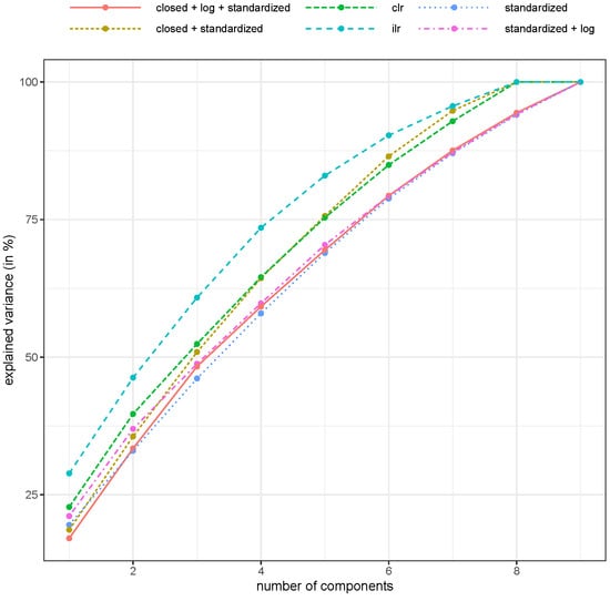The explained variance is highest with an isometric log-ratio transformation (see Figure 4), but with this transformation, the interpretation of the results was more difficult. However, the centered log-ratio results were usually better than the non-compositional methods.