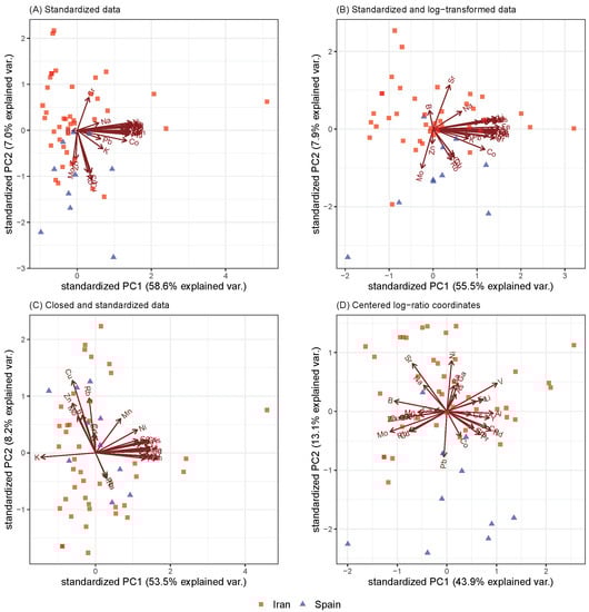 For the saffron samples, their origins (Spain and Iran) among other things were compared (Figure 3), but the same problems as we saw in Figure 1 arose but even more clearly. Standardization without transformation gave very poor results, and the negative bias was omnipresent (see Figure 3A). This could also be seen in the log-transformed and standardized data in Figure 3B. In addition, the separability left a lot to be desired in Figure 3C. On the other hand, the biplot obtained by PCA of the centered log-ratio coordinates (Figure 3D) showed a clear separation between the Spanish and Iranian saffron samples. The Spanish saffron had higher relative concentrations of lead (Pb) and cobalt (Co) and was therefore more likely to be contaminated with these two elements.