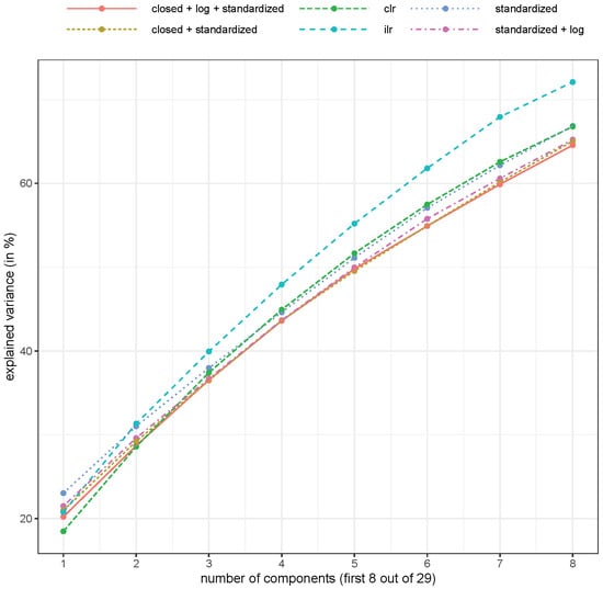 The explained variance of the first two principal components is highest when PCA was applied to pivot coordinates (46.3%, see “ilr” in Figure 2), followed by the application of the centered log-ratio coordinates (39.7%, see “clr” in Figure 2). This was also true when looking at other components, whereas this was only one of high interest for the first 1–4 components. Note that only about 46.3% of the variance in the dataset was explained by the first two components. It could be argued that this was not a high number and that caution should be used when interpreting the results because of the relatively high unexplained variance. Furthermore, it was also of interest to examine other components in biplots, e.g., to plot the first against the third component. Note also that the variance in the raw, unstandardized, untransformed dataset was almost 90% for the first two components (results not shown), but this was only related to the fact that the first two components were basically the two variables with the largest range of values, which was an uninteresting result. In other words, the explained variance is important, but many other aspects are also important (e.g., if the scores separate well). In any case, using a non-compositional treatment of the data loses a lot of explained variance, and the results might be arbitrary because the concept of an Euclidean metric in a simplex is not a proper concept.