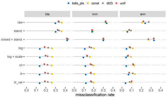 Misclassification rates of various classification methods based on different pre-processing and replacement strategies applied to the honey samples. Abbreviations (for details, see Section 3): lda: linear discriminant analyis, KNN: k-nearest neighbor, ANN: artificial neural network; bdls: below detection limit using (censored) partial least squares regression, const: constant, dl23: two-thirds of the detection limit, unif: uniform; closed + stand: closed and standardized data, raw: raw, i.e., non-transformed, log: log transformed, scale: scaled, ilr: isometric log-ratio transformed (i.e., pivot coordinates), clr: centered log-ratio coordinates.