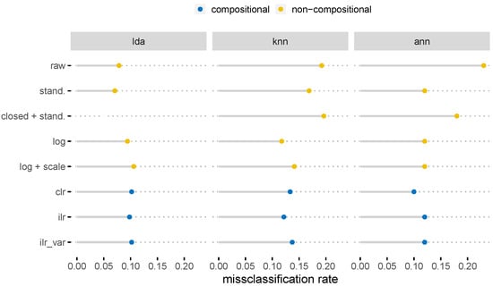 The results of the PCAs clearly showed the benefits of using CoDa, while the classification results were more diverse. Figure 5 shows the average misclassification rate quantified for different classification methods. The target variable for the honey samples holds the information about whether the observation was of raw honey, a syrup or an adulterated honey. Obviously, compositional data analysis outperformed most of the non-compositional approaches, but the results on log-transformation and log-transformation plus standardization were comparable. The reason is that the larger the number of variables, the less the log transformation differs from a (centered) log-ratio transformation. The denominator for high-dimensional compositional data usually shows hardly any data structure, only noise. This means that the main role in the observations was played by the dominant components in the log ratios. From a more technical point of view, the log ratio of the geometric means in the comparison of the log and Aitchison distances was almost 0 despite the large number of variables. We refer to arceló-Vidal et al. [38] page 189, Equation 14.1. Even if from a theoretical point-of-view the simple log-transformation is wrong [39], the results might be comparable when the dataset consists of many parts. Interestingly, the variant of the pivot log-ratio transformation (ilr_var) gave slightly better results than without any ordering of parts. As the honey dataset also contained non-detects, various replacement strategies were also considered. The replacement method based on compositional methods (method bdls_pls [40]) clearly gave the best results in subsequent classifications.