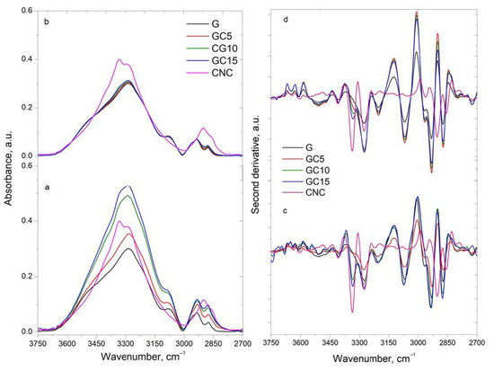 Furthermore, Figure 7b plots the bands corresponding to adsorbed water in the films at 57% RH. The integral area of these bands is 5.9 (for G), 2.82 (for GC5), 2.42 (for GC10) and 1.67 (for GC15), showing a decrease with the increasing CNC content. These results agree with the results presented above.