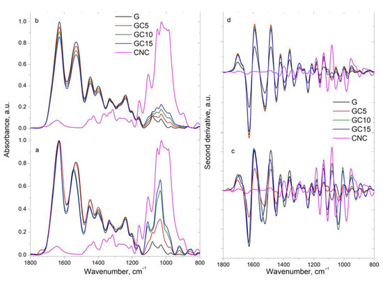 In addition, the spectrum of CNC shows some characteristic bands at 1458, 1427, 1369, 1337, 1314 and 1275 cm−1 assigned to stretching and deformation vibration of CH groups; at 1203, 1159, 1107 and 1055 cm−1 assigned to stretching and deformation vibration of C–O–C and C-O groups [23]. As for the previous region, the calculated spectra (Figure 2b,d) indicate similar bands to gelatin or CNC, which vary in intensity proportionally with the variation of the concentration of the components. However, this is not the case for the experimental spectra (Figure 2a,c), where a large number of bands vary in intensity and position.
