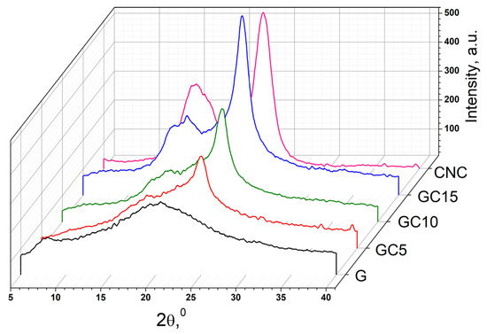 Gelatin films present a broad signal at 2θ of 20° assigned to the high content of amorphous faction and to the distance between adjacent polypeptide strands of G [33] and a small band at 7.7° assigned to triple-helix crystalline structures [32]. CNC diffractogram presented typical signals of cellulose I, such as: 15.2° signal assigned to the (1–10) plane, 16.4° signal assigned to (110) plane, 20.3° signal corresponding to (102) plane and 22.6° signal assigned to the (200) crystallographic plane [23,34]. The signals from 16.4° 2θ and 20.3° 2θ merged with the ones from 15.3° 2θ and 22.6° 2θ, being almost unnoticeable [35]. In the composite films, with the addition of CNC in gelatin matrix, the signals from 2θ = 15.3° and 22.6° increase in intensity. This can be correlated with the increasing of overall crystallinity in blends compared with gelatin film and can be a consequence of the formation of strong hydrogen bonds between the components [25]. Moreover, the signals from 15.3° and 16.4° are more visible in the diffractograms of the composite films and are shifted to higher values (to 15.5° and to 16.7°), indicating that interactions took place between the cellulose nanocrystals and gelatin matrix. These can be due to a rearrangement in the orientation of CNC crystallites after incorporation in the polymeric matrix [36]. Furthermore, with the addition of CNC, the band from 7.7° assigned to triple-helix crystalline structures from gelatin and the broad reflection from 20° decrease in intensity, being an indicator that the triple-helical structure is denaturated and the CNC interacts with the semicrystalline arrangement of the gelatin matrix [37].
