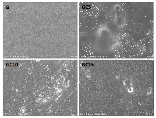 The surface morphology of gelatin-based nanocomposite films was evaluated by SEM (Figure 4).