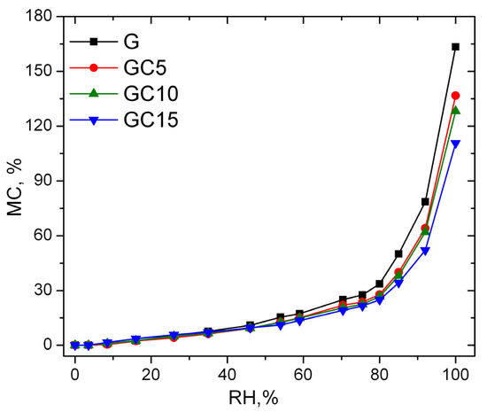 As mentioned by Van der Wel, at lower values of relative humidity, the samples adsorb a small amount of water, and up to 45% RH all the samples exhibit almost the same behavior. After this RH value, the neat gelatin film starts to be more sensitive to water molecules compared to nanocomposite films. Over 70% RH, the sorption isotherms start to have an asymptotic increase. At 100% RH, the maximum MC value decreases with the increase of CNC content in the composite films, with neat gelatin film having about 163% MC, GC5—136%, GC10—128% and GC15—110%. The later one has a maximum MC 53% lower than in case of gelatin film.